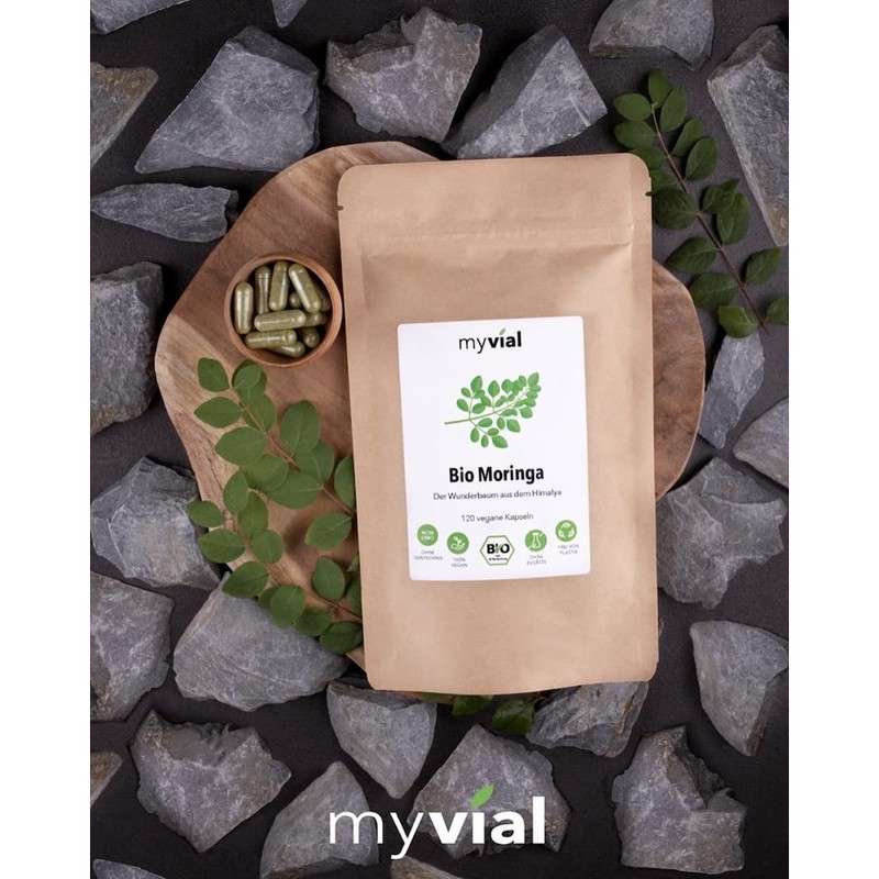 myvial® Organic Moringa Capsules High Dose Pack of 120 Vegan without Additives Plastic-Free Packaging - 400 mg Fine Leaf Powder from Moringa Oleifera Plant