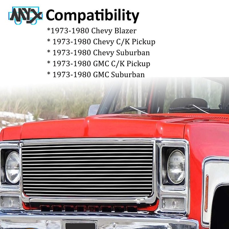 Fits Fits 73-80 Chevy C/K Pickup/Suburban/Blazer- Aluminum Horizontal Billet Grille Insert[Fitment]*Fits Fits 73-80 Chevy C/K Pickup/Suburban/Blazer Aluminum Horizontal New Style[Material] Aluminum[Color] Mirror Polished[Style] Horizontal Billet[Position] Main Upper[Pieces] 1pcs[Installation] Replacement (Cutting And Drilling Not Required)ITEM FEATURES:Air craft grade 6061-T6 aluminum solid billet grille inserts can protect the front end of your vehicle.Corrosion resistant aluminum billet grilles in polished mirror finish chrome color.Can enhance the style or function of the original stock grille.Bar width: 3.5mm ~ 4.0mm (1/8in ~ 5/32in).Sleek aluminum billet grille inserts.This Billet grille inserts make your vehicle more outstanding on the road.High quality material for long last.Grille insert only, logo or emblem, frame or shell is NOT included.Hardware and instruction are included.ABOUT USMYXAuto manufactures a wide selection of over 2,000 custom grilles from classic billet grilles to the latest trend of wired mesh grilles for cars, trucks & SUVs.we are professional auto parts designer and manufacturer.We are here to deliver customers the best possible product at the most affordable price and create the best possible customer experience. As an MYXAUTO's customer, you can rest assured that your satisfaction is our top priority. We hope you have a pleasant shopping experience with us. Thank you!