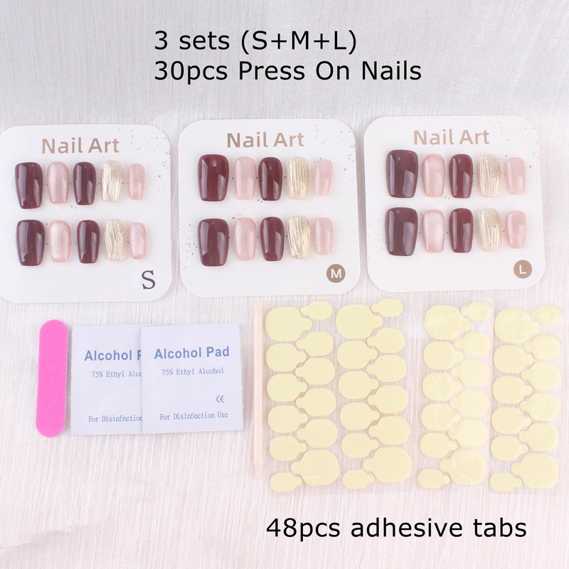 • Package Contents | 30pcs press on nails (Size - S+M+L) , 48pcs nail adhesive tabs , a cuticle stick, a mini file, alcohol pad .