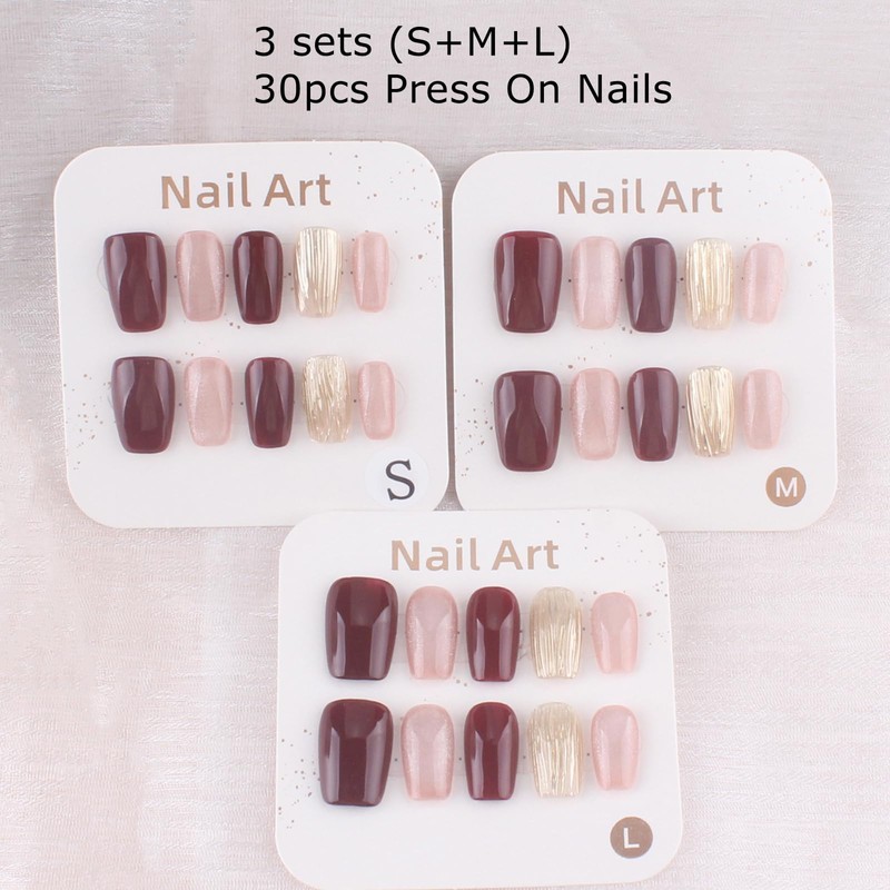 MZCMSL Press On Nails Medium Square | Handmade Wine Red & Light Pink Press On Nails, Glossy False Nails Acrylic, Reusable, Salon Quality Nail Kit, 30pcs(Size-S+M+L)