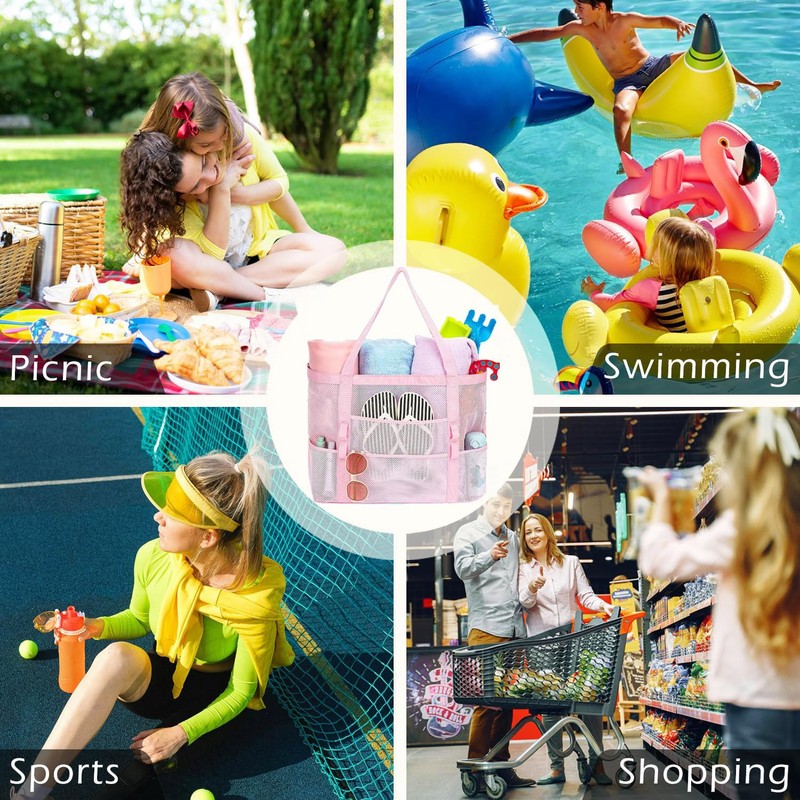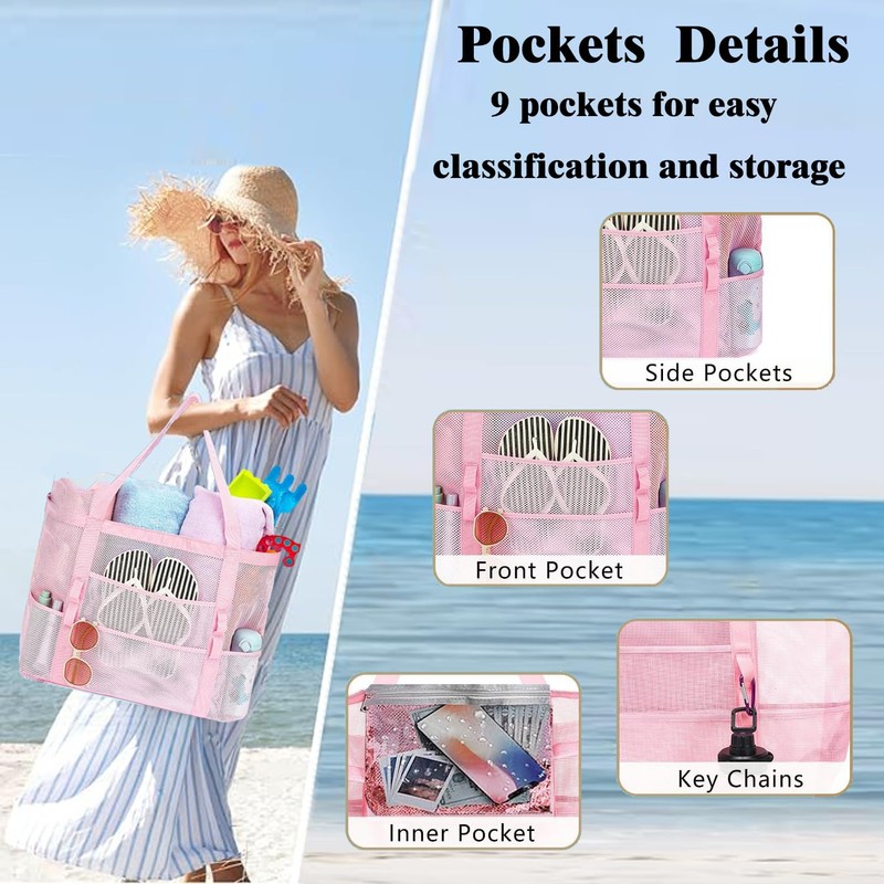 Mass Storage Space - The size of the mesh beach bag is 16.5''L X 8.5''W X 15''H that can store 6 beach towels, shoes, toys, sunglasses, water bottles, keys, phone,iPad mini, etc. The essential tote bag for the whole family vacation. Carrying belongs you need for the whole day on the beach/pool.Beach bag perfectly fits women and men. Multi-Pocket-The beach tote bag has 8 big mesh pockets outside, A built-in zipper pocket inside beach bag providing additional secure space for storing smaller or more private items. This design allows users to conveniently organize and store items, enhancing user experience. Durable Material- The beach bag adapt has high-quality tear-resistant mesh material, which is not easy to wear.durable and lightweight. Mesh beach tote is waterproof, sand-free,and easy to clean. Breathable design allows for quick-drying, avoiding mold or the unpleasant smell on your towels or wet clothes. Lightweight And Foldable - Super beach tote for women is easily folded up to fit in your carry on for travel, beach trip, family days, grocery purchasing and vacations;The mesh tote can not only save you space but also money! Fold flat and store the mesh beach tote large bag anywhere accessible to you. Multipurpose Use-These plastic pool totes are in addition to beach outings, mesh bags are versatile and can be used for various purposes. They are suitable for grocery shopping, pool, picnic, camping, gym, carrying sports gear, or organizing items in a breathable manner for any outdoor adventure.