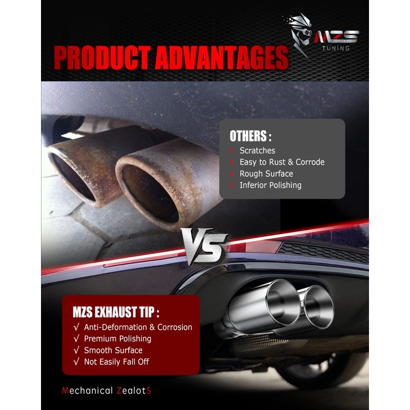 Note: MZS exhaust tip has 2.5" inlet, 3.5" outlet, and length of 9.5". Please measure the size of your tail pipe before purchase, the outlet size of the tailpipe should match the inlet size of this exhaust tip.