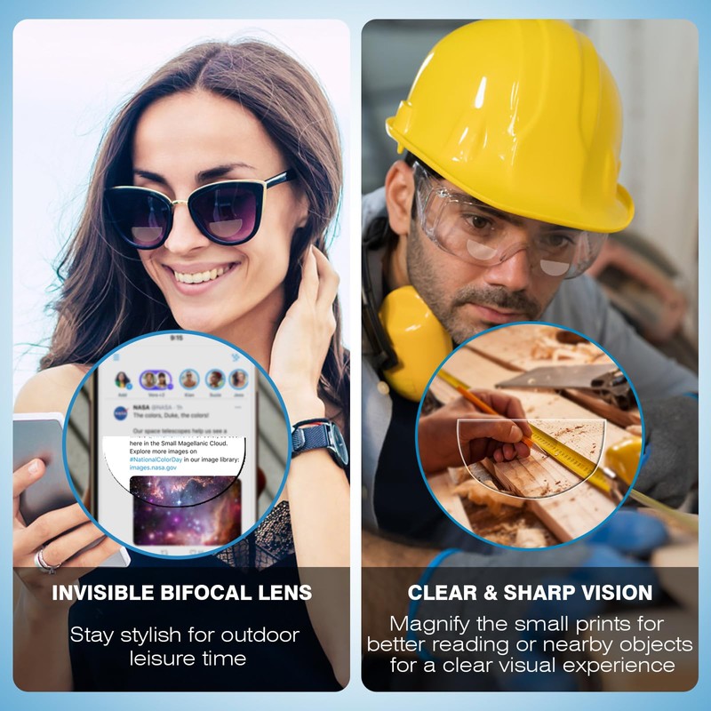- Convert Any Glasses into Reading Glasses – Instantly turn your sunglasses, safety goggles, or regular glasses into magnifying readers with our stick on bifocal lenses. No need for expensive prescriptions or extra frames.