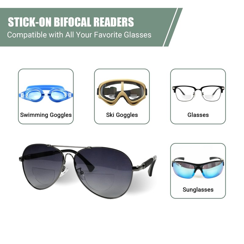 - 【Fit Any Shape or Style】Our stick-on readers allow you to convert your sunglasses, safety goggles, or any glasses into magnifying reading glasses for close work. Undetectable bifocal lenses no one will even know you have them on.