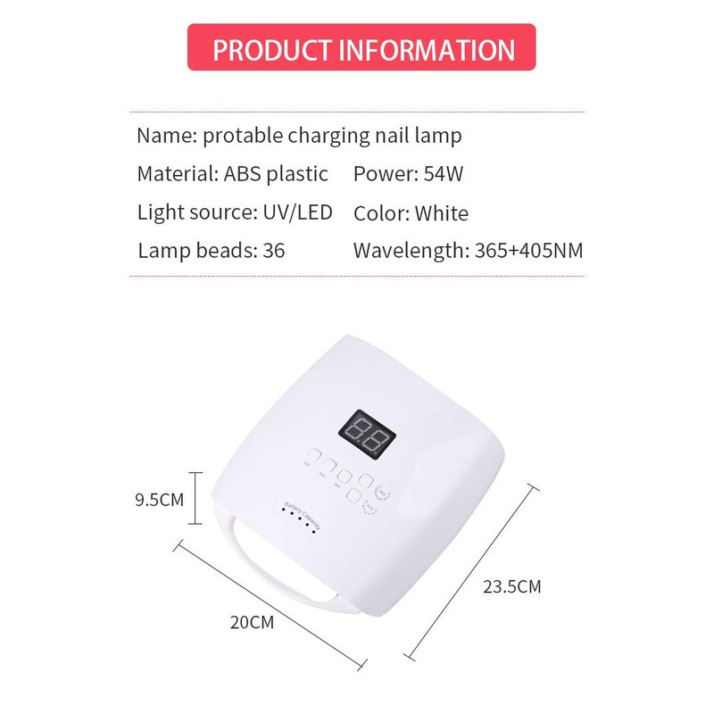 Item NameY6 54W UV LED Rechargeable lamp Features/Description 1.Comfort light,reduce burning sensation. 2.The sun does not harm the eyes,the roast is not black 3. 15pcs stategically placed LEDs,No dead-zone,more free. 4. 50000hours life time. 5. light on with hands put inside human body sensor 6. Double lightsore(365+405nm)LEDs to cure UV gel/builder/LED Gel. INPUT VOLTAGE100-240V 50Hz/60Hz RATED OUPUTDC :13.5V2A Battery capacity:3pcs 3000 mAh rechargeable batteries Battery use time:The charge time is 2 hours and it can be used for 2.5 hours. TIMER:10.30s.60s.99s Product size:23*20*9.5cm Packaging size:23*21*10cm LEDS:36 Color:White Warranty:12 months Certificate:CE ROHS FCC MarketEUROPE:USA