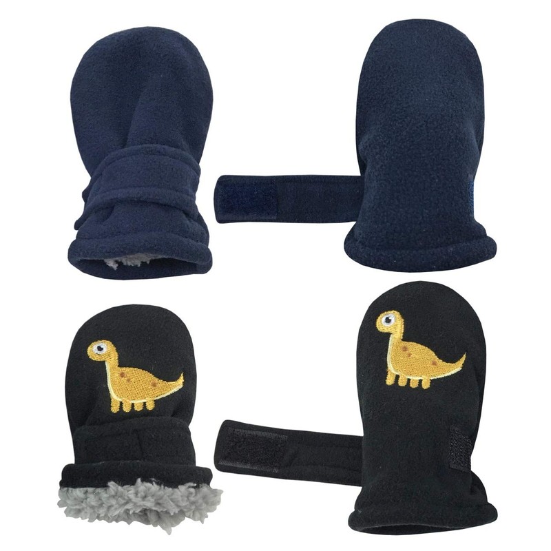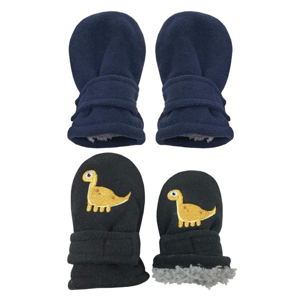 N'Ice Caps Little Kids and Baby Easy-On Sherpa Lined Fleece Mittens - 2 Pair Pack (Black Dinos/Navy Solid - Infant No Thumbs, 6-18 Months)