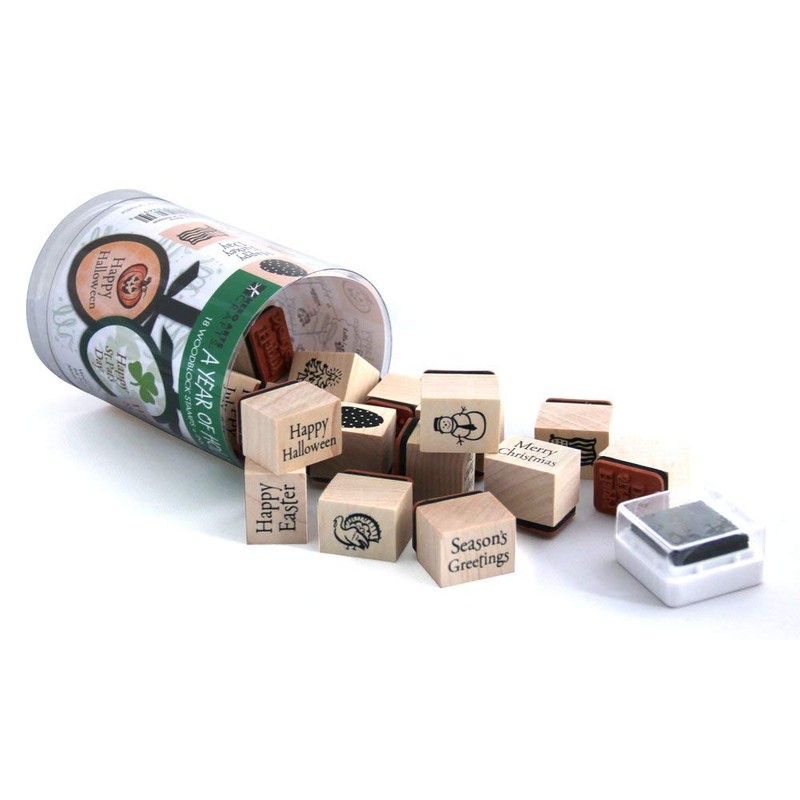 - 3インチ x 4インチの浴槽には、18枚の木版スタンプと1つの小さなインクが入っています。