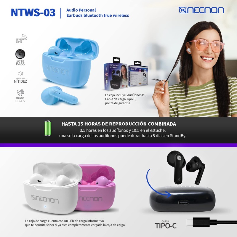 N NECNON AUDIFONOS INALAMBRICOS IN-Ear NTWS-03 (Azul)