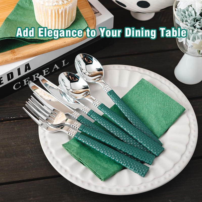 N9R 90pcs Silver and Green Disposable Silverware Set, Elegant Plastic Silverw...