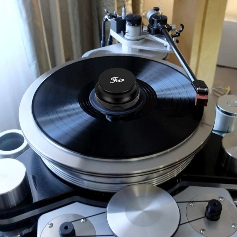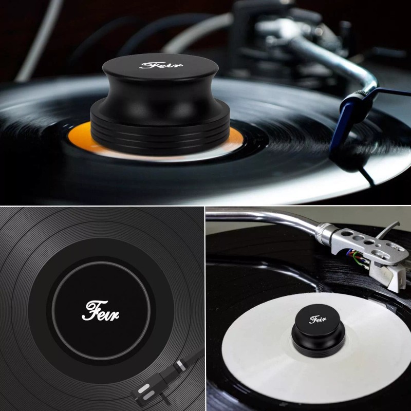 Looking for a simple yet efficient way to improve the harmonics of your LP’sTired of having your records needlessly skip or suffer from unnecessary resonance Start enjoying your records and LP’s the way they were meant to be with Feir Hi-Fi’s Vinyl Stabilizer. By using our record weight stabilizer and the Black Rubber Silicone protective mat as a buffer between the record weight and record, you will be able to greatly reduce resonance and vibration as your records play, which in turn will provide you with drastically improved sound quality. Classy and Effective way to improve your Vinyl Performance -Highest Quality Record Weight 14 ounces -Clamp’s weight adds to your platter mass -Increases Rotational Velocity Stability -Easy to use and store. Have it handy at all times More Reasons to choose Feir -Improve Sound Quality: Sufficiently eliminates warped records wobble,holds the record flat against the platter,improved the sound quality. -Weight distribution is centered nicely by bottom pad. It help to reduce the noise out of records. -Helps your Records sound as they should! Why wait go to add it to cart and order it Right Now! You will not miss it!!