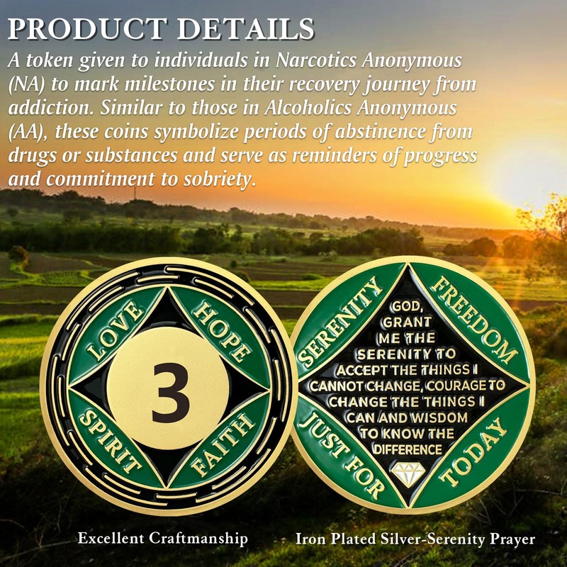 • ✨Distinctive Design✨: Our NA Medallion features a striking gold-plated coin with a green inner circle enveloped by a black diamond shape on the front. The diamond's sides are inscribed with the NA symbol, along with "LOVE," "HOPE," "SPIRIT," and "FAITH." In the center, a laser-engraved inner circle displays numbers 1-6, representing years of sobriety. It is perfect for just for today narcotics anonymous book