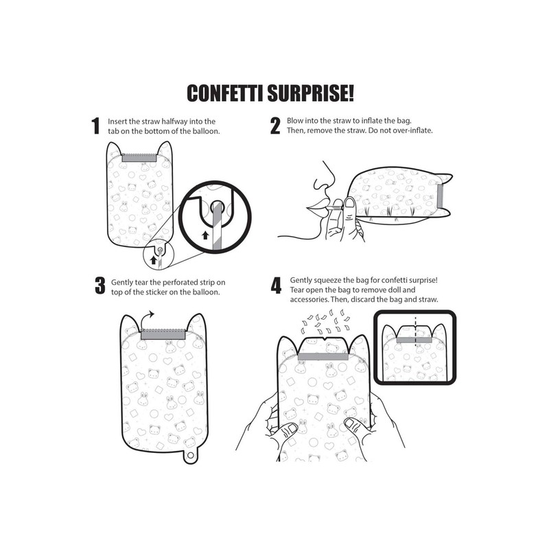 - Balloon packaging – Isla hides in a foil balloon that offers an exciting unpacking experience. Inflate the balloon with the straw and squeeze it together for a confetti surprise. Open the bag to reveal your plush doll