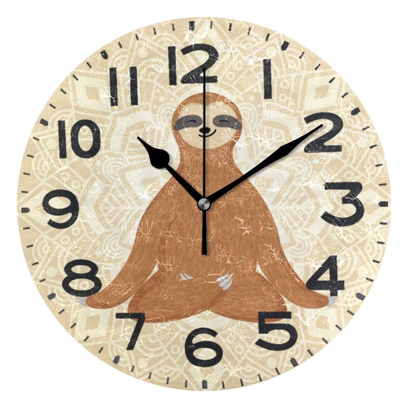 Naanle Cute Cartoon Sloth Sitting in Yoga Lotus Pose and Relaxing Round Wall Clock Decorative, 9.5 Inch Battery Operated Quartz Analog Quiet Desk Clock for Home,Office,School(Brown)