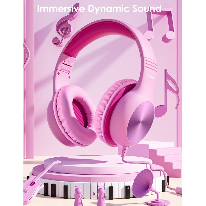 Nabevi Kids Headphones, Childrens Headphones with Microphone, 85dB/94dB Volume Limit, HD Sound, Sharing Function, Adjustable Foldable Wired Toddler Headphones for School/Travel/PC/Phone/Kindle, Pink