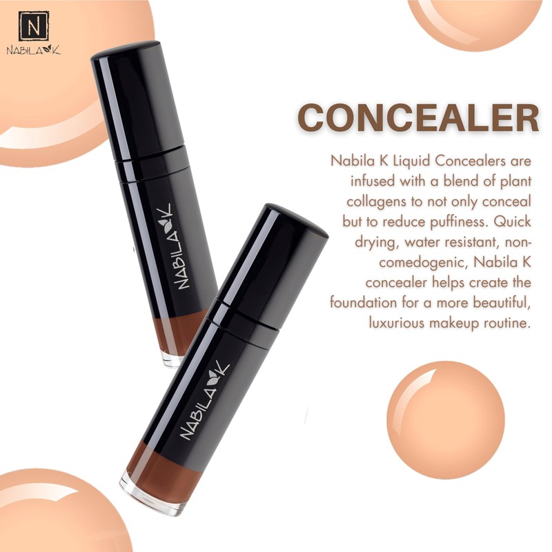 • Nabila K Liquid Concealers are infused with a blend of plant collagens to not only conceal but to reduce puffiness. Quick drying, water resistant, non-comedogenic, Nabila K concealer helps create the foundation for a more beautiful, luxurious makeup routine.