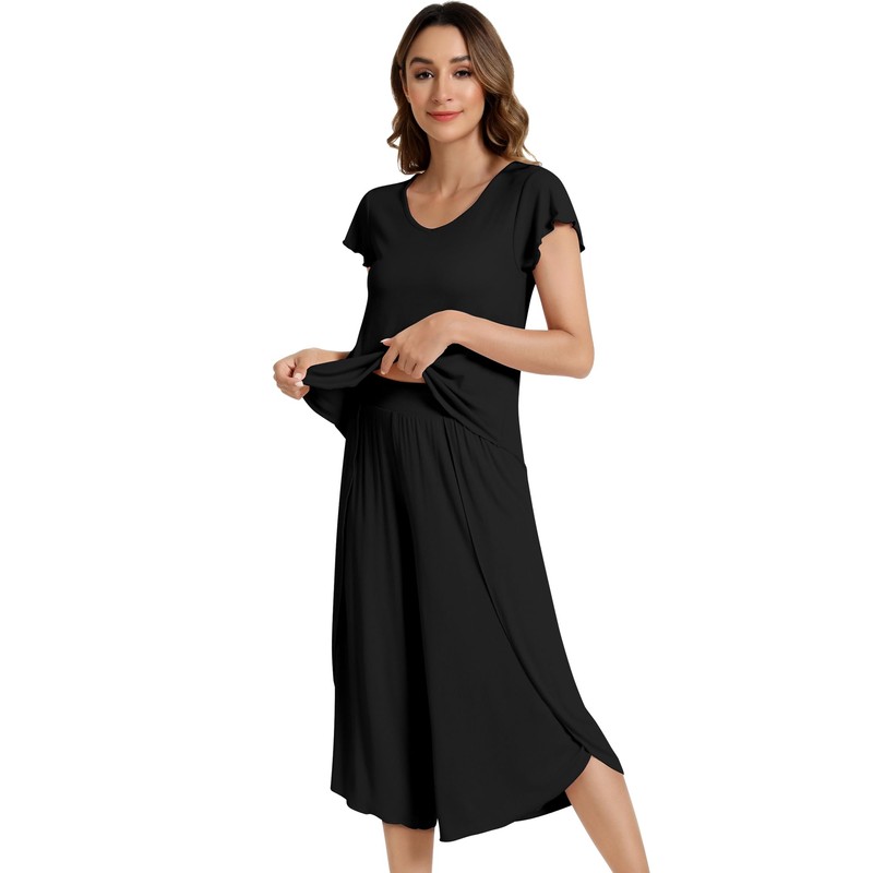 - [Cap Sleeve Design]: The lightweight pajama top is designed with a cap sleeve and v-neckline. The cap sleeve design allows ample space for the arms to move freely. Capri pants with a soft elastic waistband. The sewn ruffle edge makes sleepwear more stylish.