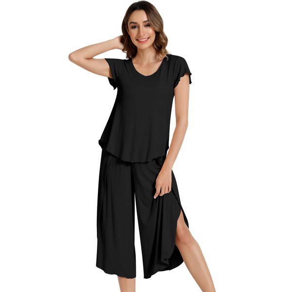 NACHILA Women's Pajamas Set-Viscose Made from Bamboo,Short Sleeve Sleepwear Soft Pjs with Capri Pants Loose Loungewear Black M