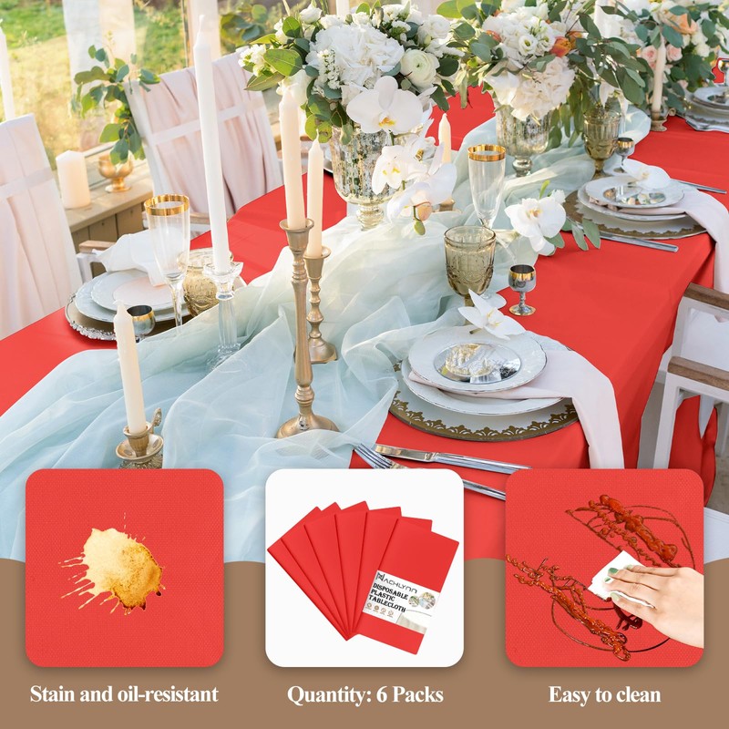 NACHLYNN 6 Pack Disposable Plastic Tablecloths 54 x 108 Inch Red Rectangle Table Cover for Holiday Party Engagement Weddings Baptism Birthday Decoration