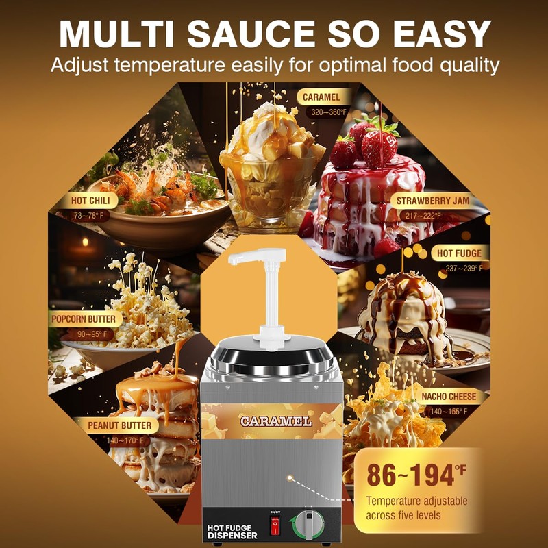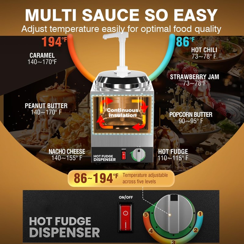 - Five Adjustable Temperature Settings: Our Hot Fudge Dispenser is equipped with a user-friendly rotary button, allowing you to effortlessly adjust the temperature within a range from 30°C to 90°C (86°F to 194°F). This means you have the freedom to control the temperature according to the specific requirements of different ingredients. With its rapid heating and excellent insulation, your food will consistently remain in its optimal state. For instance, you can set the temperature to 60°C (140°F)