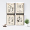 - Product details: set of four pictures with coloured backgrounds in vintage style. Corkscrew, barrel, corkscrew, wine press - patents in retro style.