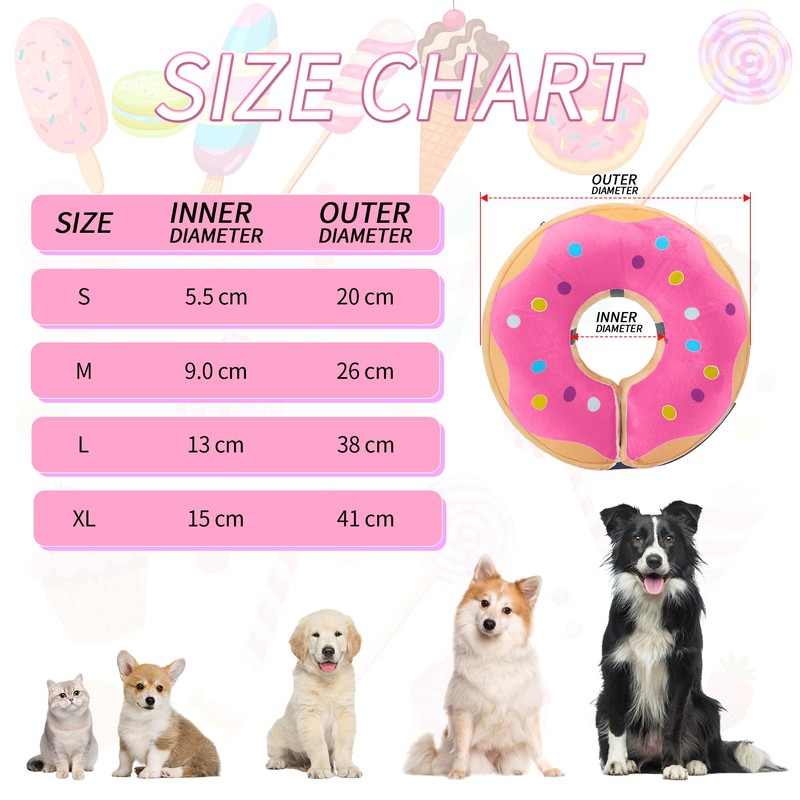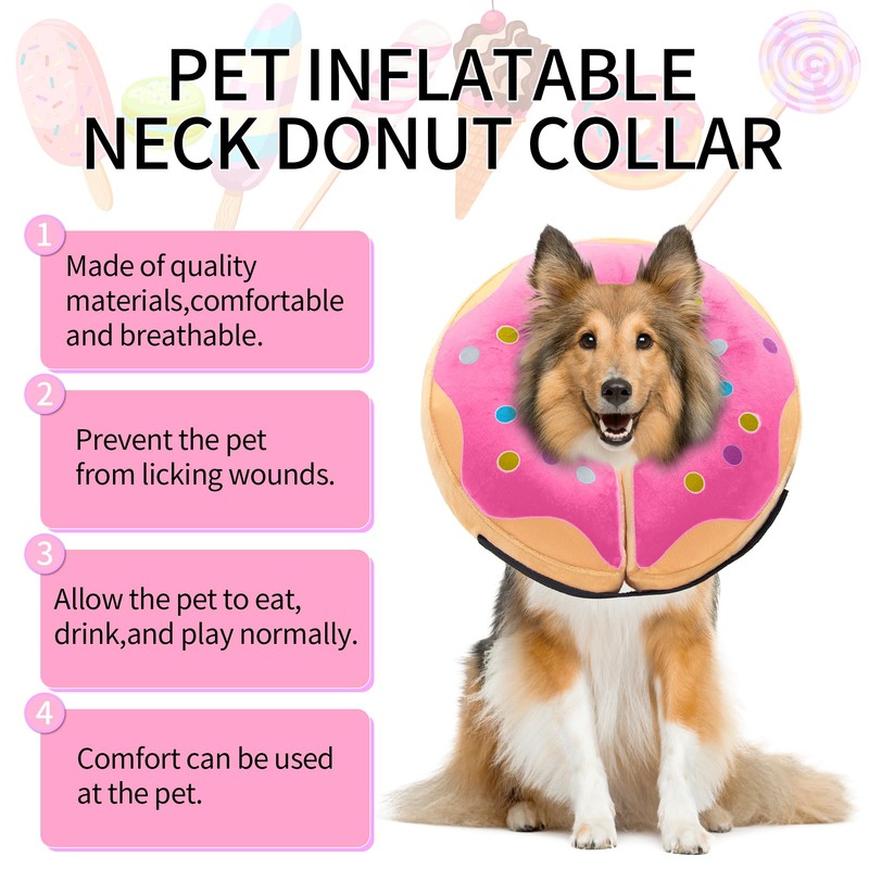 - This inflatable dog cone is designed to be both functional and fun. Its donut shape and bright colors make it an attractive option for dogs. Once the healing process is complete, it can also be used as a pillow, providing added comfort for your pet. The cone does not interfere with your pet's ability to eat, drink, or play, allowing them to maintain their normal routine while they recover.