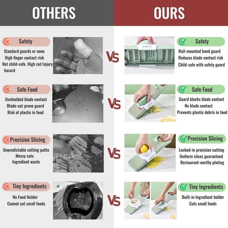 • Safe & Smart Hand Guard‌ – Our sliding-track hand guard wraps securely around the slicer body, keeping veggies in place for straight, even cuts. Unlike loose guards that may shift and touch blades (risking plastic scraps in your food), this semi-fixed design stays safely anchored while slicing. Easily detach it when not needed