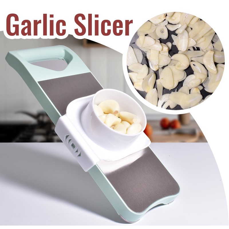 • Slice Garlic Effortlessly & Safely - The pusher/hand guard doubles as a garlic holder, featuring an internal spring that automatically presses cloves against the ultra-sharp blade for complete, even slicing. Choose between two interchangeable thickness blades (1mm/3mm). Perfect for garlic, ginger, and other small vegetables—eliminating uneven chopping and food waste