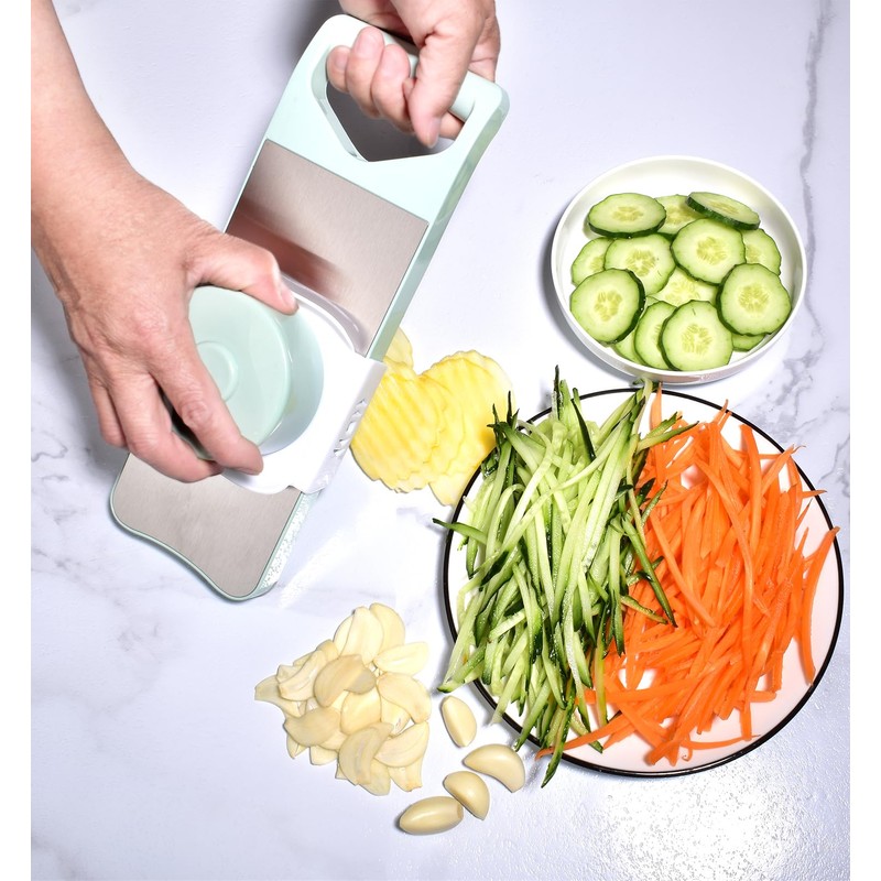 • 5-in-1 Versatility - 5 interchangeable blades meet your Slicing ,Shredding& Grinding needs.Including 1mm Straight Slicer,2mm Shredder,3mm Shredder,Waffle Slicer and Ginger Grater.The two Shredding blade settings work great for sushi, salads, and Vietnamese spring rolls