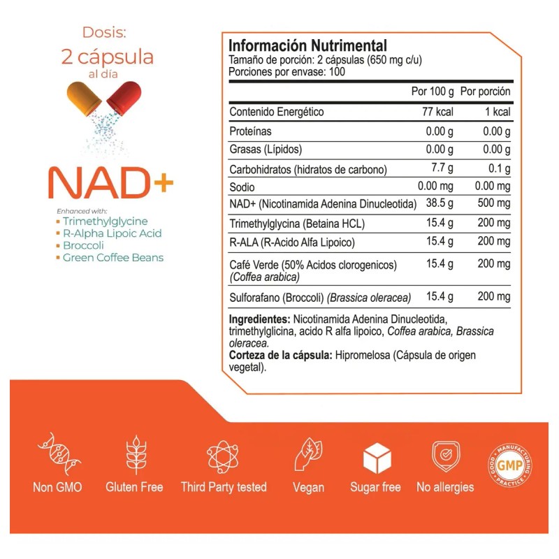- 🧬 Salud Genética: Al mantener niveles óptimos de NAD+, el NAD ayuda a regular funciones genéticas clave, como la reparación del ADN y la actividad de las sirtuinas, que son esenciales para la longevidad celular.