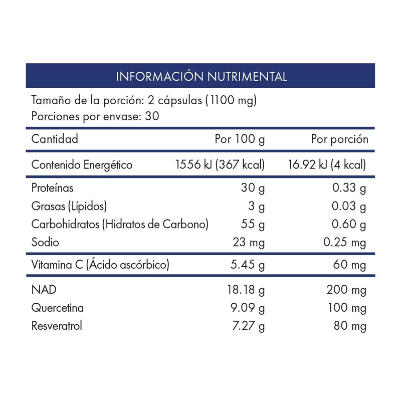 - Fórmula avanzada con NAD+ y antioxidantes naturales: Suplemento alimenticio en cápsulas con NAD+, Quercetina, Resveratrol y Vitamina C. Ideal para complementar tu rutina de bienestar diario.
