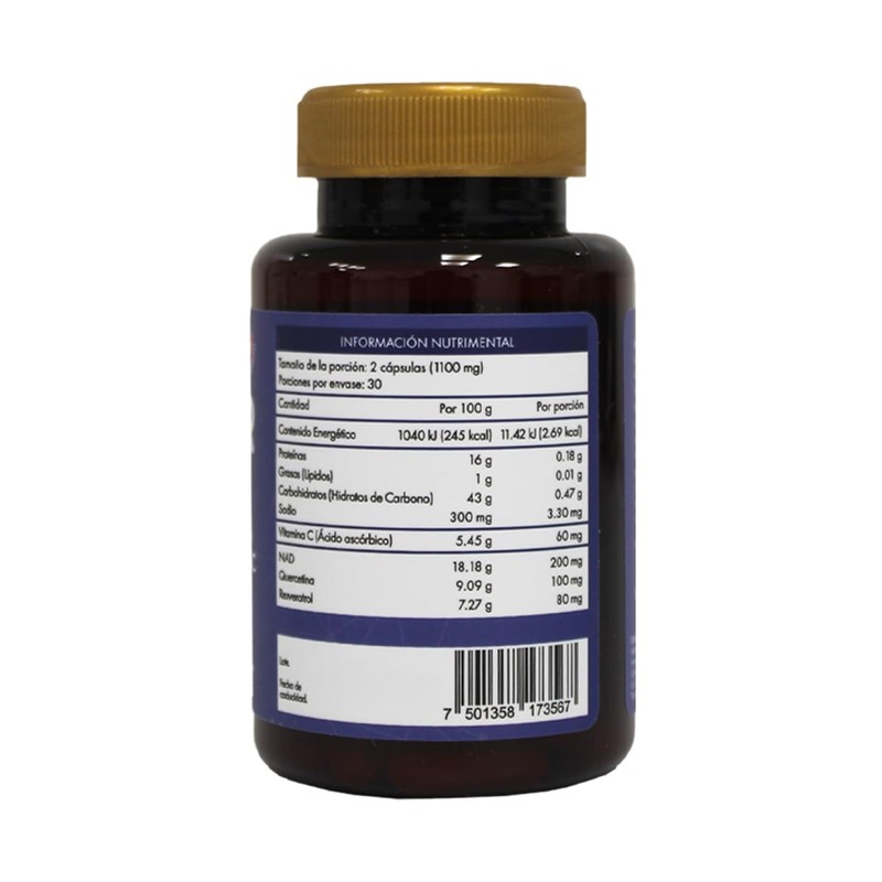 - Con Resveratrol y Quercetina: Ingredientes reconocidos por su perfil antioxidante, que contribuyen al bienestar general cuando se integran a una dieta saludable.