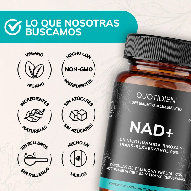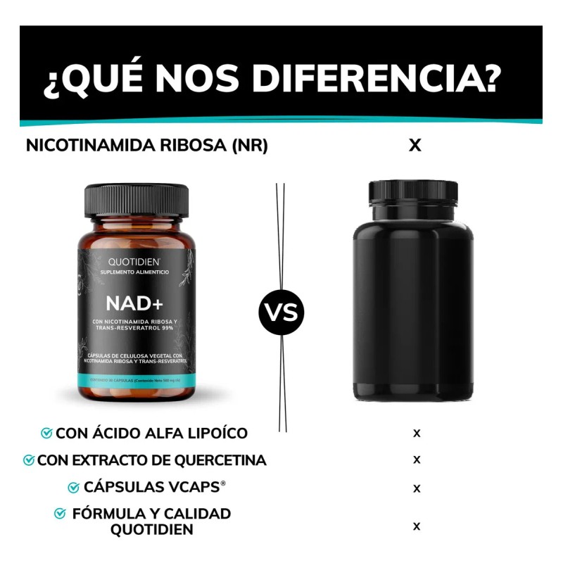NAD con Trans-Resveratrol y Ácido Alfa Lipoico, una fórmula avanzada diseñada para respaldar tu vitalidad y bienestar diario de manera efectiva. Esta combinación premium ofrece una sinergia potente en cápsulas veganas de alta calidad, perfectas para quienes buscan un apoyo integral para su estilo de vida activo.