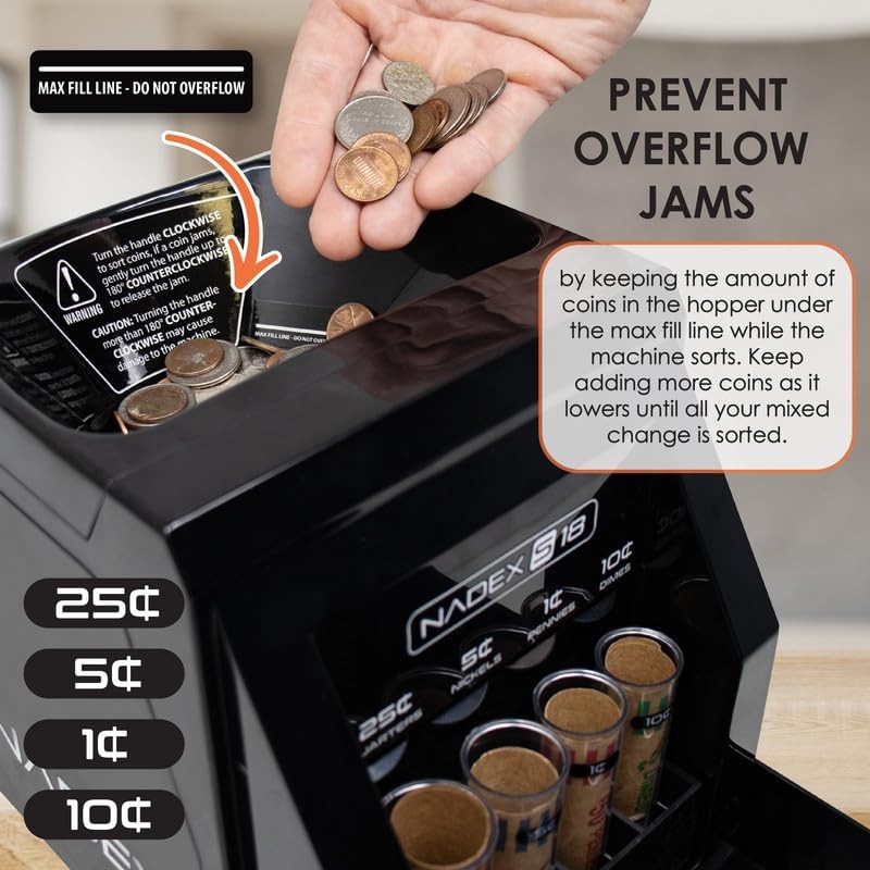 - Easy coin wrapping with a simple hand crank that separates coins by denomination.