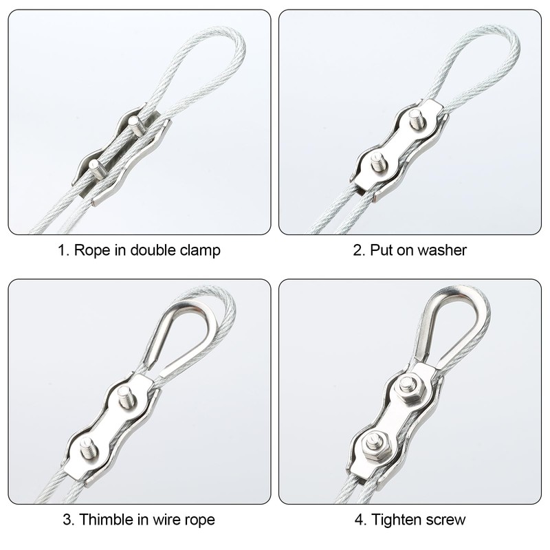 - 【Easy to Install】Wire cable clamps 3mm consists of wire rope thimble, bolt, nut and washer, when you use it, first insert the steel wire rope into the wire rope thimble, then insert the steel wire rope into the stainless steel wire rope clamp, insert the washer and finally tighten the two nuts.