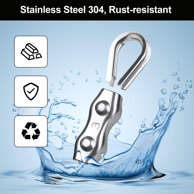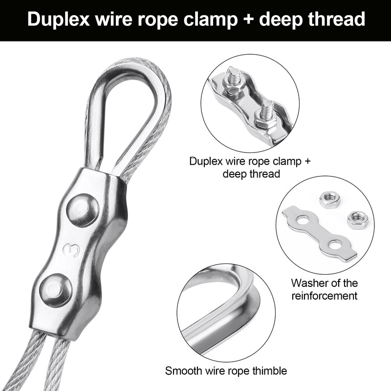 - 【304 Stainless Steel, Rust Resistant】Wire rope clamp 3mm and thimbles are both made of high quality 304 stainless steel, smooth and burr-free surface, not easy to oxidise, with excellent rust, corrosion and oxidation resistance and high bearing capacity, thick and durable, and exposure to complex outdoor environments is also no cause for concern at all.