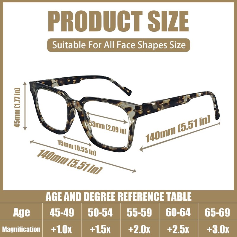 - 👀Available Diopter Magnification:+1.0 +1.5 +2.0 +2.5 +3.0. (1.0 is the weakest lens, and 3.0 is our strongest lens).The frame is comfortable to wear and the lenses light transmittance is very good.Suitable for different face types. Perfect gift for your friends, parents, grandparents and relatives.