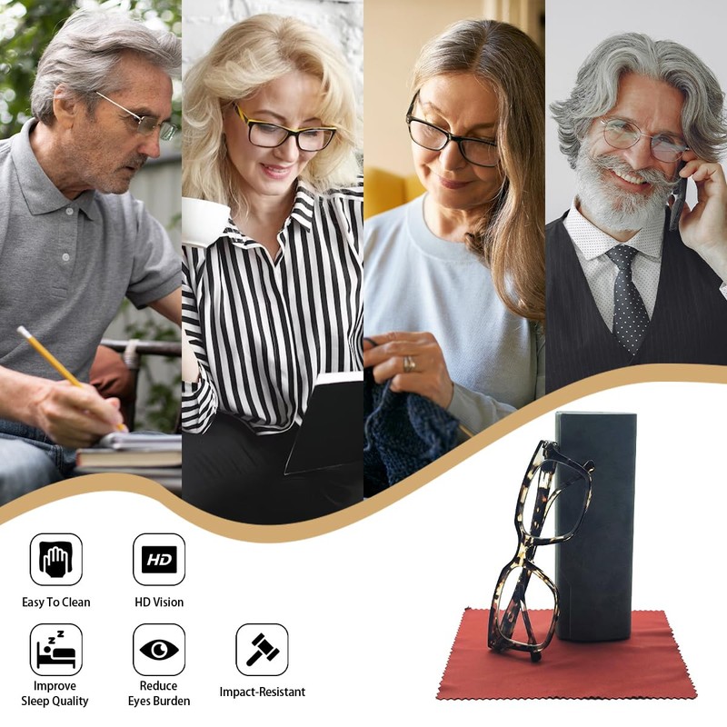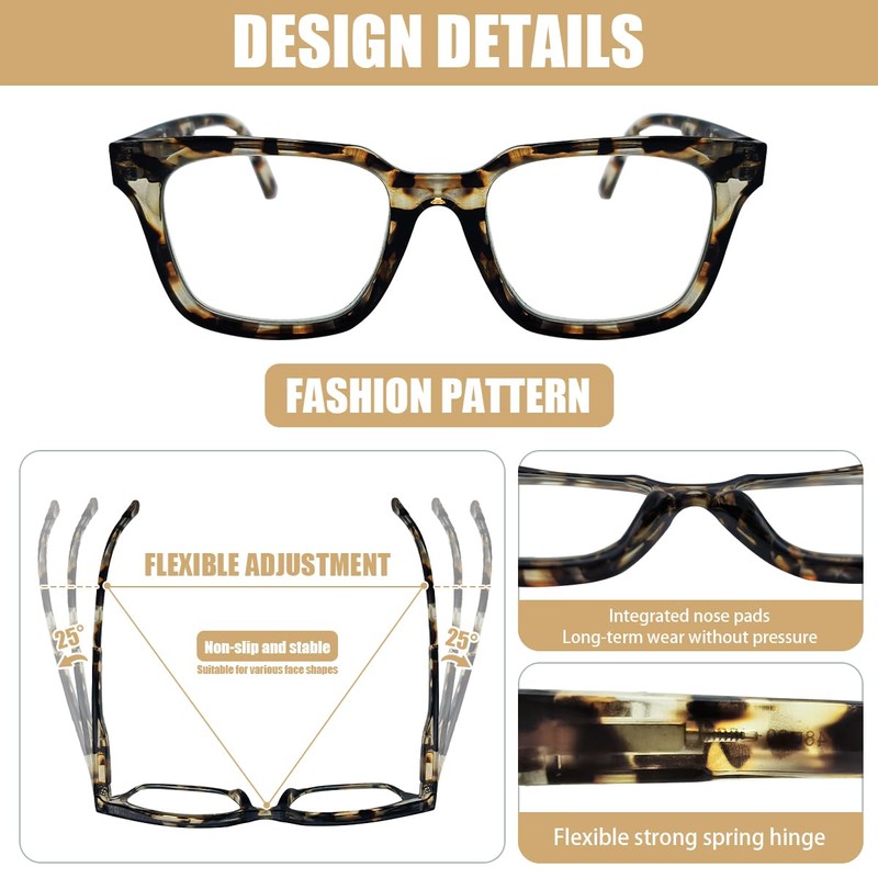 - 👀Reading glasses adopt flexible and impact-resistant TR frames. The frame material is strong to the touch, but very light on the face. Easy to clean, stain resistant, not fragile. Has good elasticity and is not easy to break and drop(Bending up to 180°)