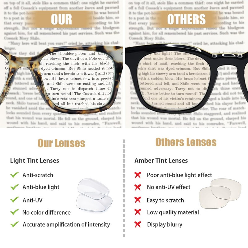 - 👀BLUE LIGHT BLOCKING LENS: A-class computer reading glasses , cut more than 99% of harmful blue light. Magnifying lens, suitable for presbyopia. Relieving eye strains and headache when reading or using electronic products.