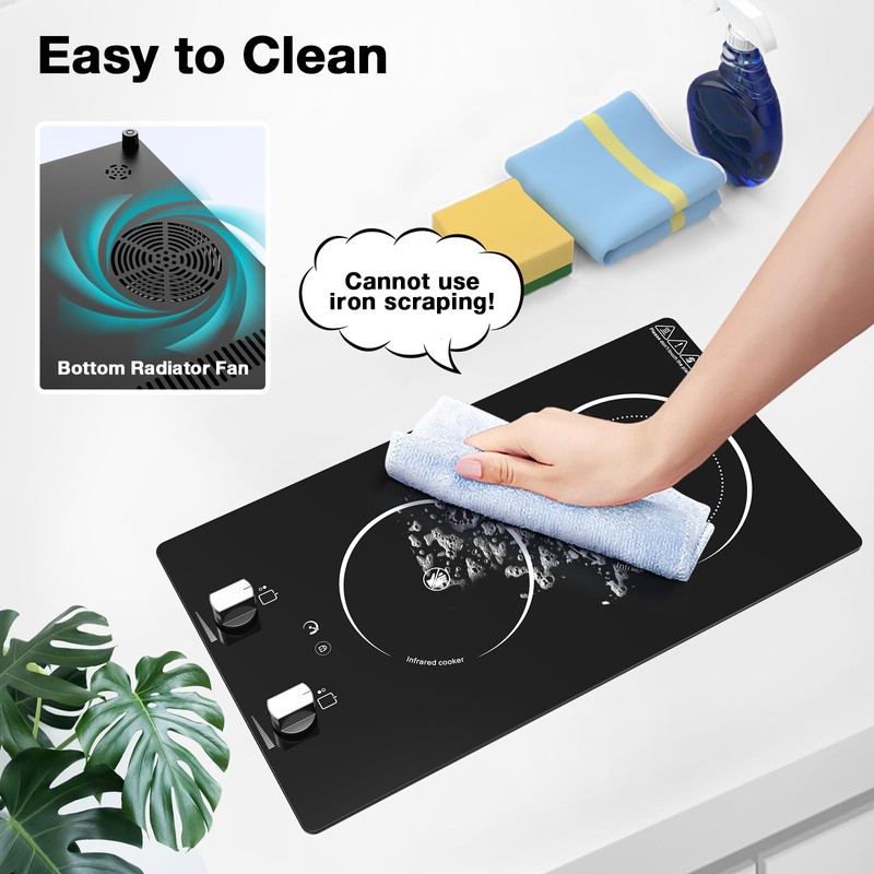 - 【Safety Two Burner Electric Cooktop】: The electric stove 2100w is built-in multiple safety protection measures, such as built-in overheat protection, residual heat indication, auto shut-off and child safety lock, to ensure the safety of you and your family. The bottom is also equipped with a cooling fan, which effectively extends the service life