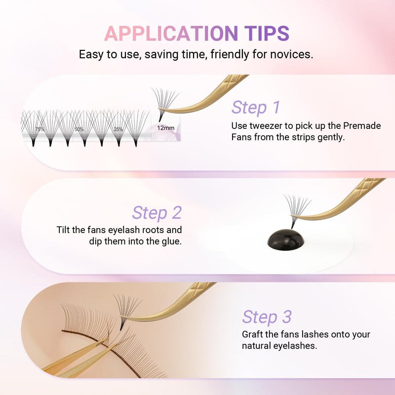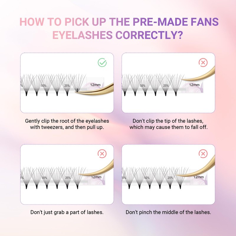 - Time-saving: pre-made, voluminous fan eyelashes can speed up the eyelash application process. You have more time to serve more customers. Please gently touch the eyelashes with the tweezers to avoid breaking or falling off. To make fans yourself with tweezers, no knowledge is required, so you can complete a voluminous eyelash extension in a short time.