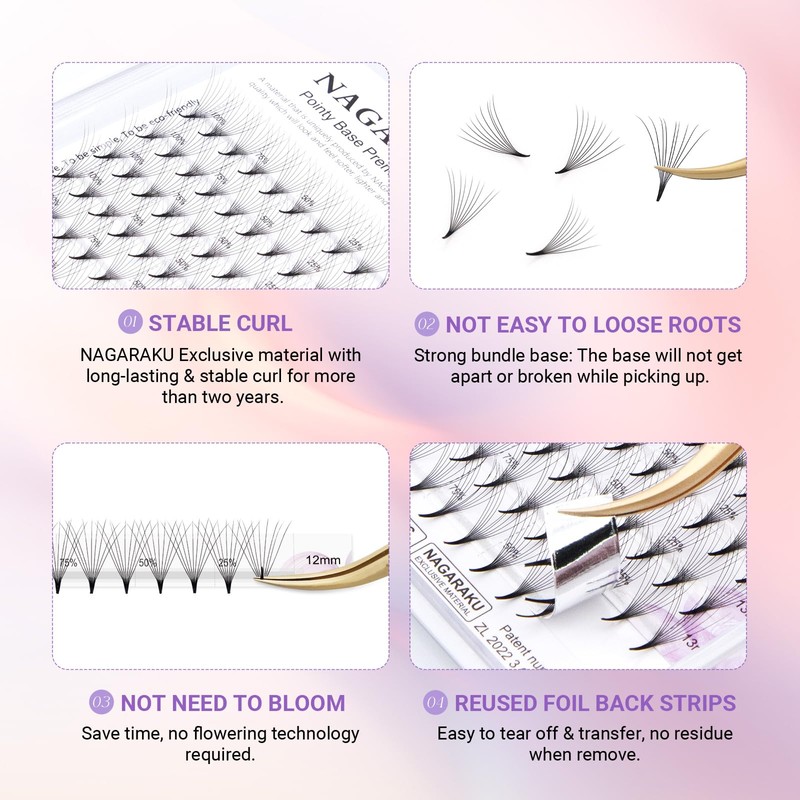 - Stable curves: the pre-made fan eyelashes are made of high-quality PBT material, which is very soft and lightweight. The exclusive Nagaraku material and craftsmanship ensure that the eyelash extension is curved longer and no glue residue is created. Our special Nagaraku curl standard can stay stable for more than 2 years.