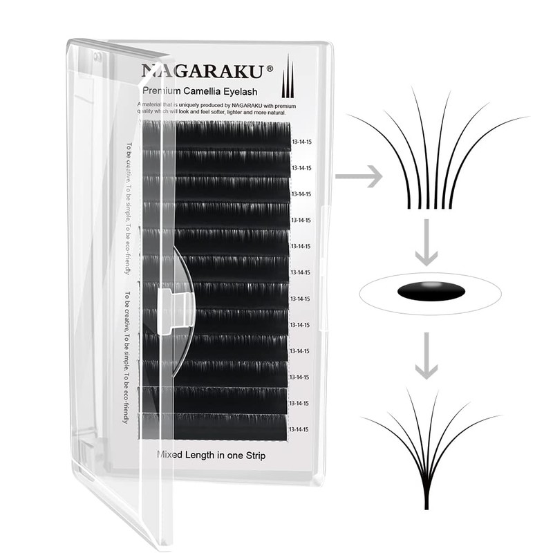 - SOFT & LIGHT: Our single lashes are made of premium NAGARAKU PBT materials, which is close to natural lashes, totally handmade, which are very comfortable for professional eyelash extensions. Camellias volume fans are super soft because they have a mix of shorter and longer lash extensions in each fan, so they are much lighter than regular 1 length per fan lash extensions.