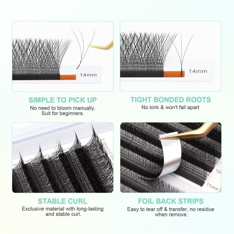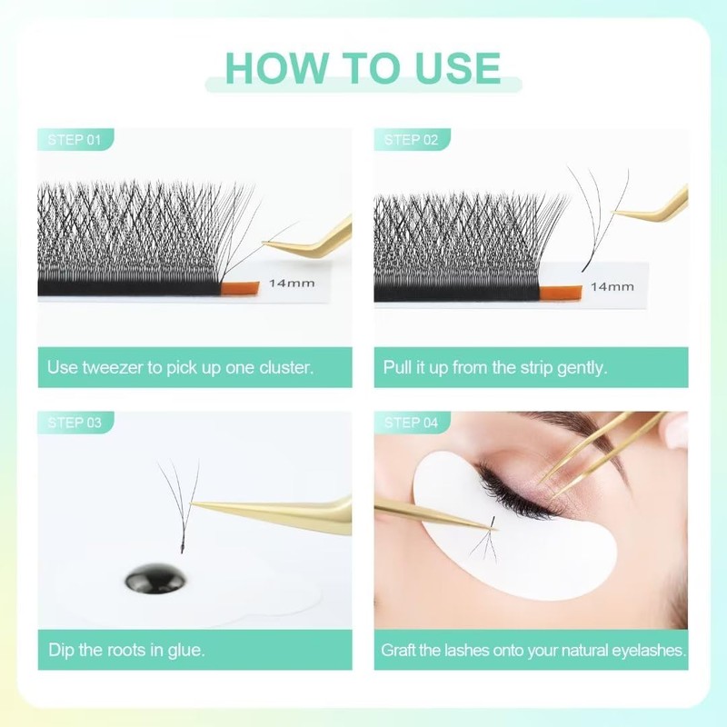 - đ ăEasy to USEăGraft 4 eyelashes simultaneously, saving a lot of time. Just clamp the middle part of the eyelashes and lift it towards your right hand, you will get W-shaped lashes, create 4D fans in one second, natural fluffy. 1 tray eyelash can be used on 10-15 customers.