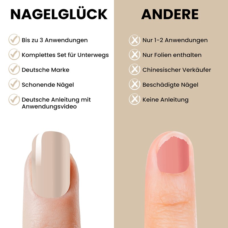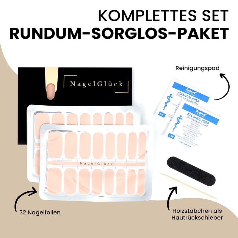 - 💅PERFEKTE MANIKÜRE UNTER 15 MINUTEN. Wir wollen Ihnen die Anwendung so einfach und unkompliziert machen, wie möglich. Unser „Rundum-Sorglos-Paket“ enthält ein perfekt zusammengestelltes Set aus Nagelfolien, Nagelfeile, Holzstäbchen und Reinigungspads. So können Sie Ihre Nägel von Überall machen.