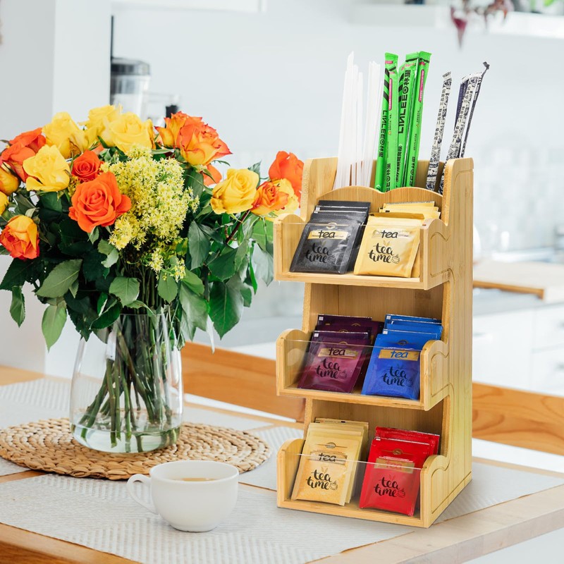 Nagpew 3 Tier Bamboo Coffee Condiment Station, 6 Compartments Coffee Tea Holder with Removable Acrylic Front Wall, K Cup Organizer Sugar Pod Utensil for Countertop, Office, Home, Kitchen