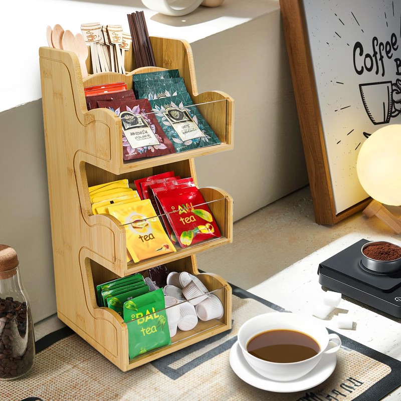 - Efficient Organizer: Able to put straws, stirrers, spoons, coffee sticks, disposable cups, syrup, teabags, K cups, condiments in. The top layer is separated into 4 parts, suitable for bar-shape items