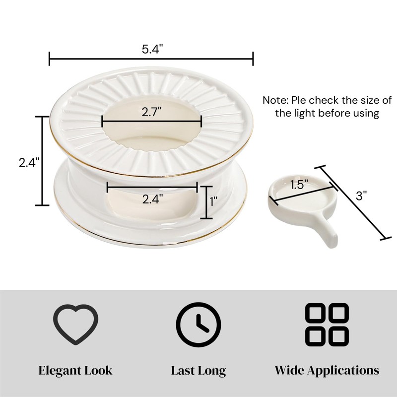 - Package and Size: You will receive a piece of ceramic teapot warmer and a small holder for candle. The warmer is about 5.4'' in diameter and 2.4'' in height. The holder is 1.5'' in inside diameter. Pls check the size before purchasing