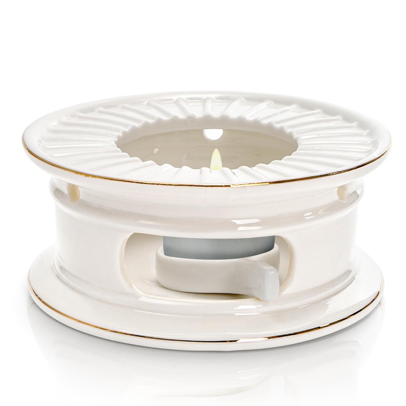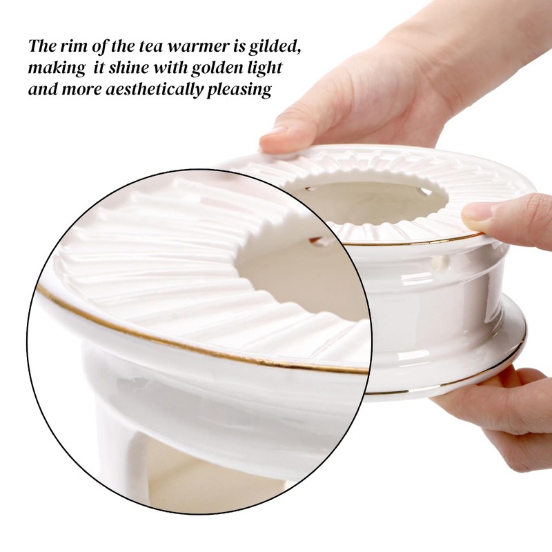 Nagpew Ceramic Teapot Warmer, Gold Rim Teapot Heater with Candle Holder, White Porcelain Tea Kettle Holder Warming Base for Heating Coffee, Milk, Water, Soup