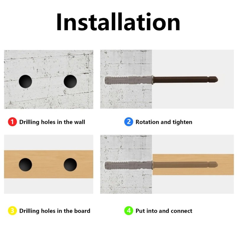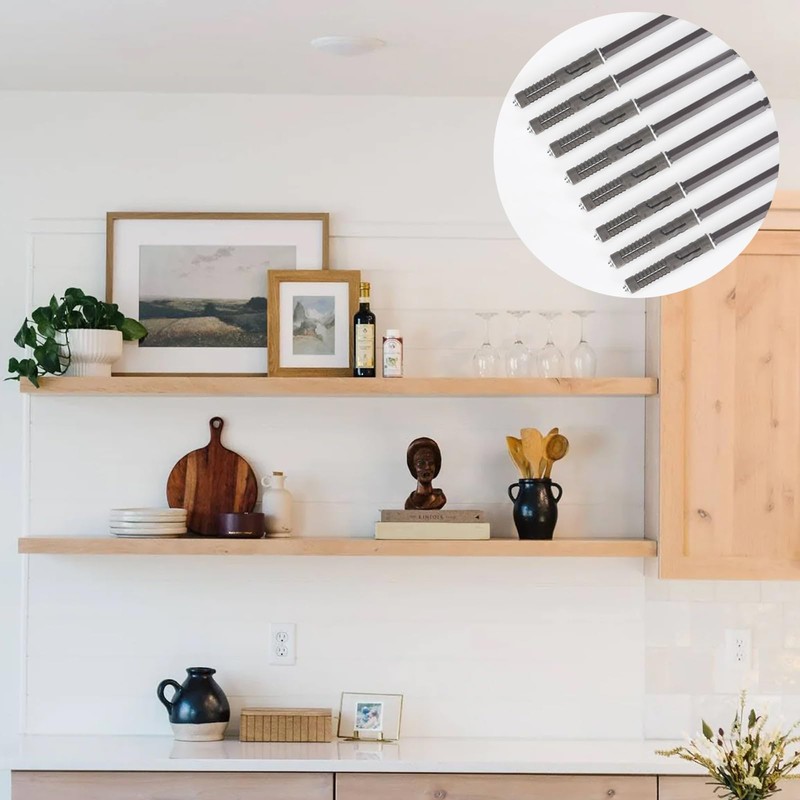 • 🛠 Easy & Secure Installation – Simply drill a hole, insert the barbed hexagonal rod into the wall, tighten the screw, and slot the other end into your shelf. The plastic sleeve protects both wall and wood for damage-free mounting.