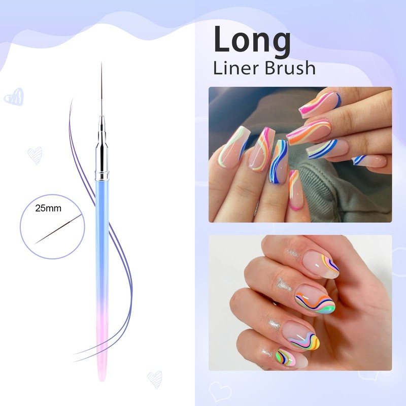 - Usage - Dip the nail art liner brush into an appropriate amount of nail polish and lightly paint on the nails. This thin nail art brush is very suitable for painting flowers and other patterns on the nails. You can outline any desired pattern according to your own needs. The acrylic nail art brush set is suitable for use at home or in the salon